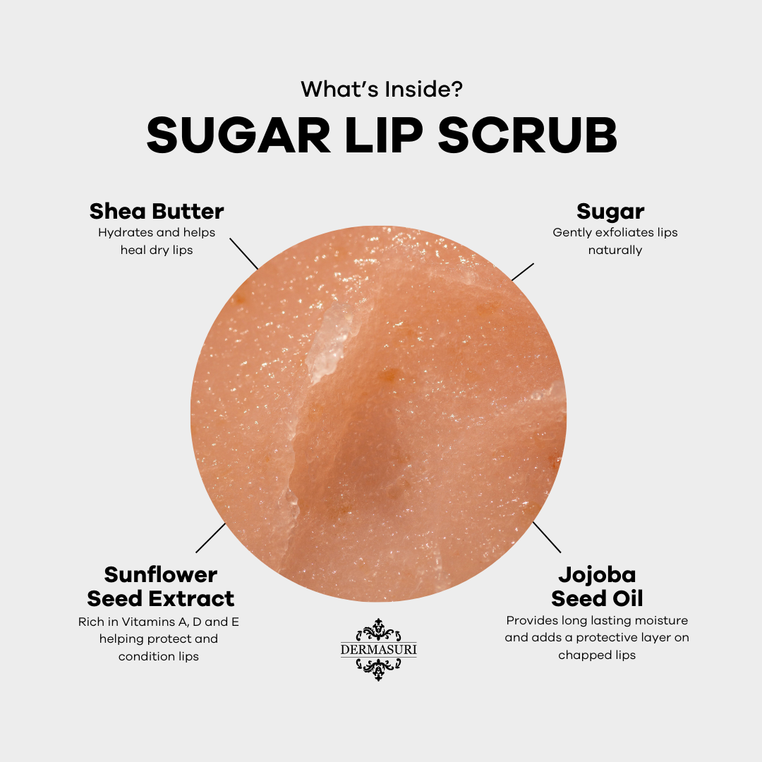 Reveal softer, smoother lips with the Dermasuri Sugar Lip Scrub — a gentle exfoliating polish that removes dry, flaky skin while deeply nourishing with moisturizing natural oils. Refined sugar crystals work to lift away buildup without irritation, while coconut oil, jojoba seed oil, shea butter, and sunflower seed extract help hydrate, soothe, and protect lips. Perfect for dry, cracked, or dull lips, this scrub preps your pout for lipstick, balm, or everyday wear with a radiant, healthy finish.