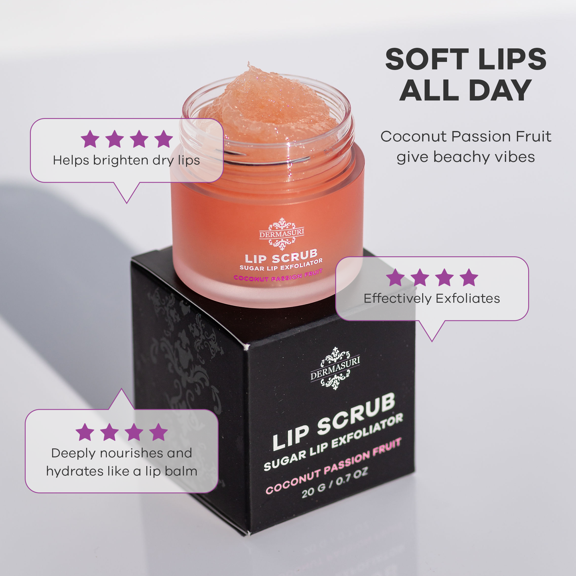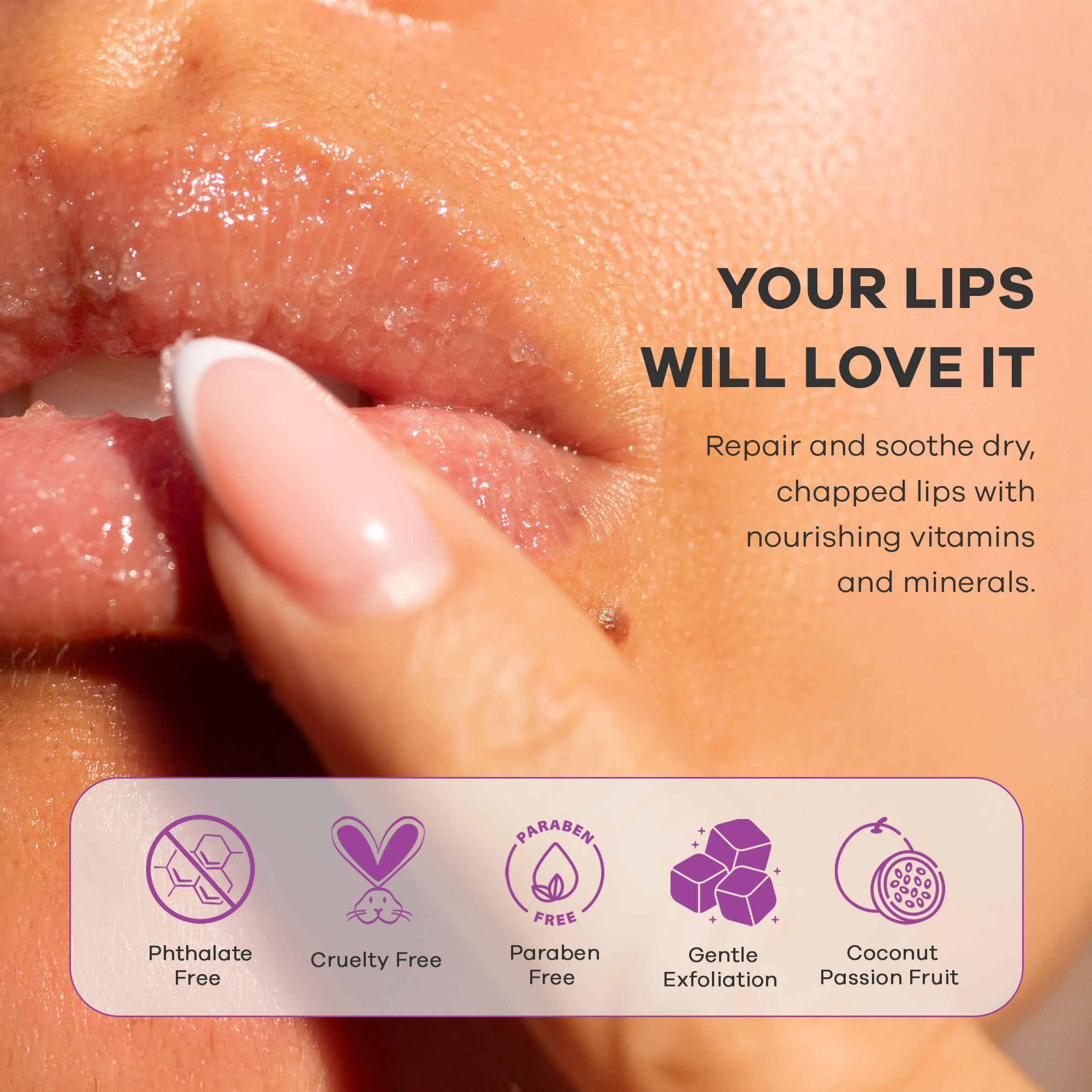 DEEP HYDRATION WITH COCONUT OIL - Infused with coconut oil, our sugar lip exfoliator deeply hydrates and soothes your lips, leaving them feeling luxuriously soft and pampered 24 hours a day.